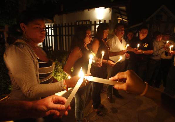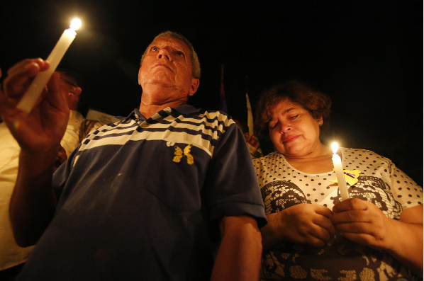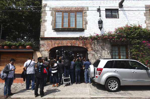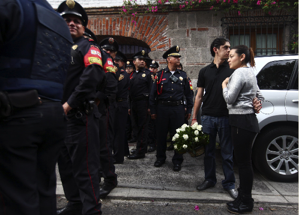 4月17日,在墨西哥首都墨西哥城,一对情侣拿着花束站在作家加西亚·马尔克斯家门口。