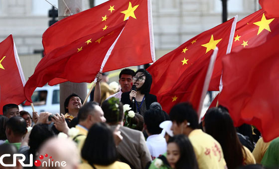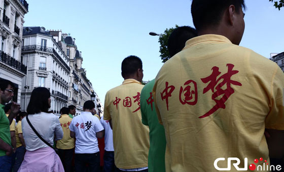 当地时间2014年6月15日,法国巴黎,香榭丽舍大街上红旗飘飘。华人共进会的发言人正在集会现场发表小型演讲,该协会是本次活动的主要组织者。图片来源:胡巍/CFP