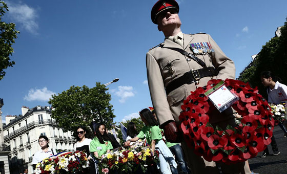 全球公益慈善联盟和法国华人共进会15日在法国巴黎凯旋门举行仪式,隆重纪念参与第一次世界大战的中国劳工。