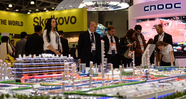 6月16日,在俄罗斯首都莫斯科,与会者在第21届世界石油大会展厅参观。