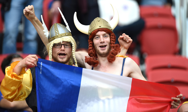 6月15日,两名法国队球迷在比赛前为球队加油助威。