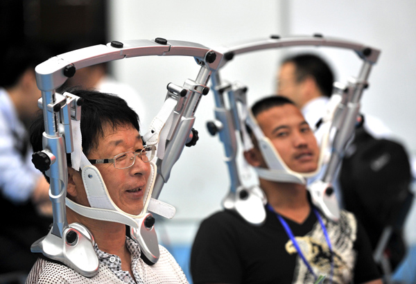 6月18日,工作人员在展区展示治疗颈椎的简易设备。