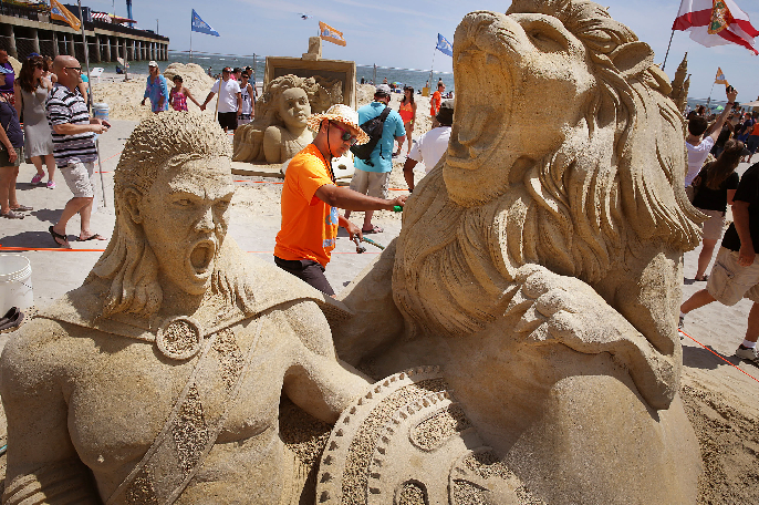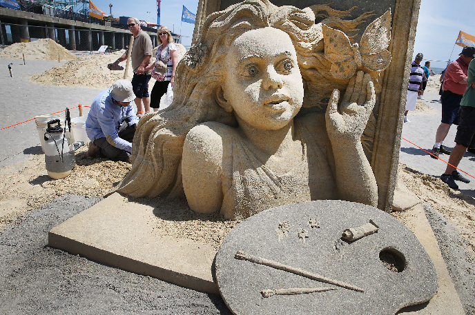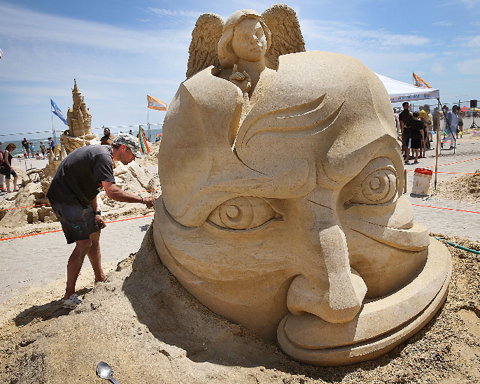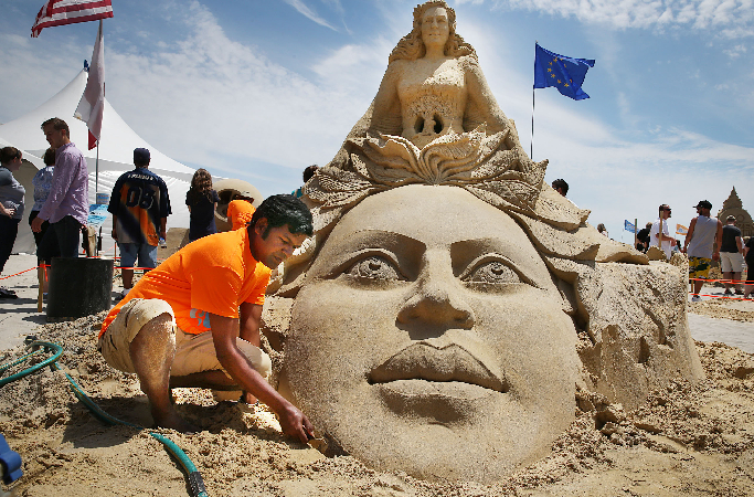 6月22日,在美国亚特兰大举行的沙雕世界杯上,来自新加坡的艺术家在制作沙雕。