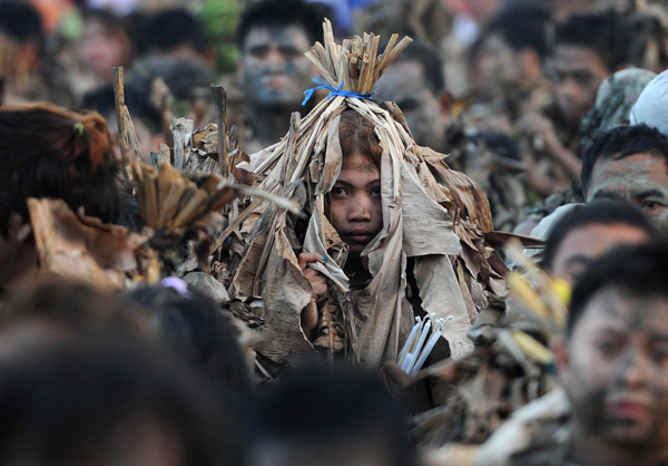 6月24日,在菲律宾新怡诗夏省阿利亚加,身穿香蕉叶的“泥人”参加纪念圣约翰日的活动。