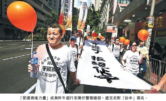 「愛護香港力量」昨午亦於銅鑼灣崇光百貨集合后游行至灣仔警察總部,向警方遞交3萬個反對「占中」的市民簽名,表明向一切占領、搗亂及暴力說不。愛港力發言人指出,「占中」主事者將他們的違法行為美化,年輕人可能因留有刑事案底而影響升學就業。他們狠批「占中」顛倒是非黑白,為香港造成永不磨滅的傷口,不能因「出於善意」便能罔顧法紀。