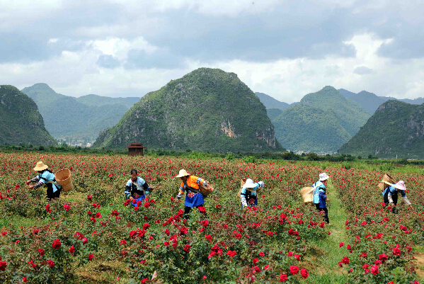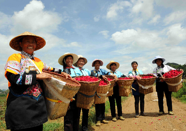云南省丘北县尚金色大地玫瑰花种植专业合作社大力发展高原特色玫瑰花种植和旅游观光产业,以“合作社+农民成员+基地+销售”的运作模式,带动当地1300户农民种植玫瑰花,2014年种植总面积6000亩,平均每亩收入6000多元。