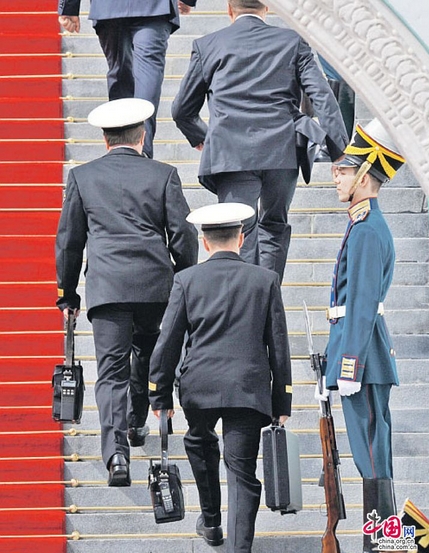 戈:由戈尔巴乔夫的夫人赖莎引进的。她从美国人那里看到后,便要求苏联的提箱人也着海军军服。在此之前提箱人着普通军服。