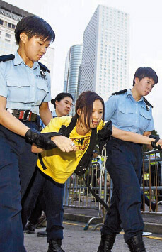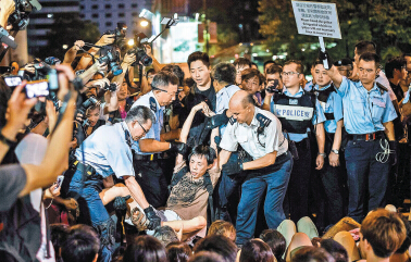 昨日凌晨2時40分,警方督察級人員向現場非法占據路面的人士發出最后通牒后,宣布清場在場示威者手扣手組成人鏈對抗,結果被每組4名警員逐一抬走,由一輛輛旅游巴送往黃竹坑警察學校臨時拘留中心處理其間警方及示威者代表各以大聲公互指不是。