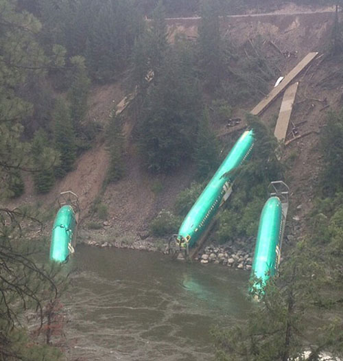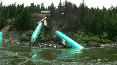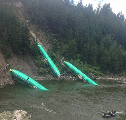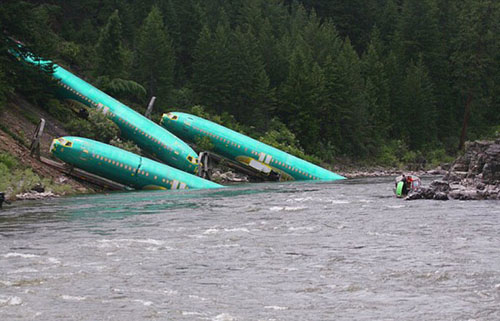 报道称,该列车共有19节车厢脱轨,大部分车厢装载飞机部件,其中3节机身滑下河堤,掉入河里。救援人员迅速乘坐救生艇顺着克拉克福克河前往救援。庞大的机身分散在河滩上,看上去就像好莱坞灾难大片的场景。此次事故并未造成人员伤亡。