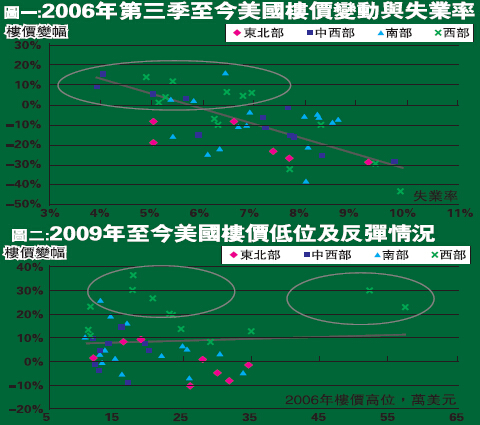 如筆者一向所言,美國經濟復蘇之所以比預期緩慢,一大因素是建築就業復蘇能力不濟,這見諸近年建築就業人口升幅落後於其他行業上。就業復蘇,購買力應增強,樓價自然回暖,所以樓市能否健康復蘇與就業應成正比。圖一中,筆者計算了美國各州樓價於金融海嘯前高位至今的變動與同期平均失業率的關係,結果見到兩者呈統計顯著(超過99%)的反比關係,相關系數亦達0.70,即失業率愈低,樓價上升力度愈高,反之亦然。