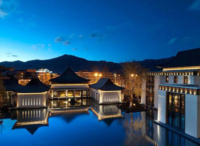 酒店中,藏式元素和色彩無處不在,但它顯然超越生硬的符號拼貼,把藏式的繽紛熱鬧轉化為低調的奢華。酒店被4米高的淺灰色磚牆包裹,穿過兩旁灌木林立的鵝卵石小道,進入一個四方天井。天井四周是深紅色露天圍牆,罩有黑木制成豎條網格,間隔適當地擺著當地打造的銅獅,冷靜而莊嚴,中心還設有一個黑瓷磚小水池,當中佇立著藏族的焚香塔。據稱淺灰色磚牆和黑色塔式屋頂設計旨在向西藏古老的文化致意,而天井式院落的設計靈感也正是來自大昭寺和色拉寺等傳統藏族寺廟。
