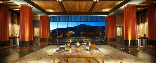 酒店設計除了強化藏式文化之外,也將自然景觀及高原獨有的美麗天空和強烈光照作了有機融合。據介紹,酒店第一層加高了10多米,就是希望「酒店的高度與拉薩最主要的寺廟布達拉宮齊平,這樣一來,客人就能領略到完美的景致。」在大堂露台及客房窗戶外望,是喜馬拉雅山和拉薩河谷的壯麗美景,而藍色天空下遠方的布達拉宮,也宛若一幅畫兒。