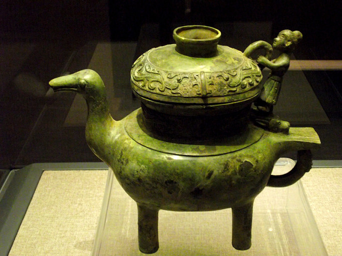 盉與爵配套可以盛酒,與盤配套亦可盛水。鴨形盉以鴨腹為器身,背部開口,上面加蓋,腹下鑄柱狀足,鴨首當流,鴨尾作盉,盉上站立一小銅人,以其手足將器身與器蓋巧妙地連為一體。蓋沿與口下飾長尾鳳鳥紋一周。蓋內有陰刻銘文43字,筆畫均勻,字跡清晰。銘文記述應國使者「匍」到氐這個地方探訪邢國的國君邢公,邢公派一名官員會見了他,并贈送給他一些禮物。后來匍用邢公所賜的銅做了這件盉,以作紀念。