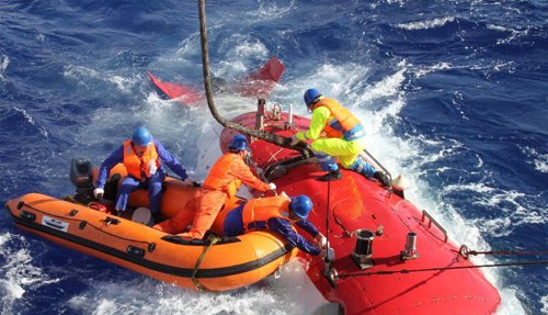 7月16日,蛙人在为“蛟龙”号载人潜水器解除吊缆。新华社记者 罗沙 摄