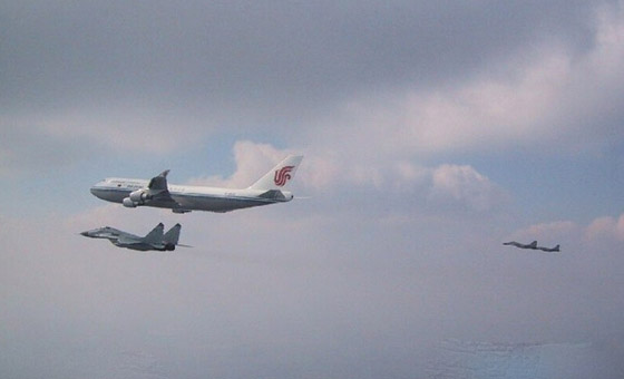 此前,机号为B-2447的波音747-400客机也曾执行过一段时间的专机飞行任务。在国内的专机飞行任务则多由空34师的其他客机承担。图为访问俄罗斯时,俄空军米格-29战机为其提供护航。