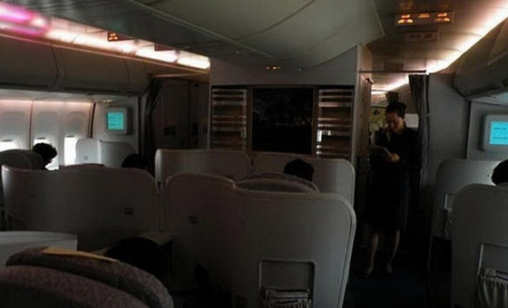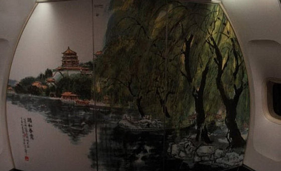 当然,前舱也会有些小惊喜,比如备份机B-2471的机舱隔断上就被画上了一幅国画。画面是颐和园昆明湖的景色。