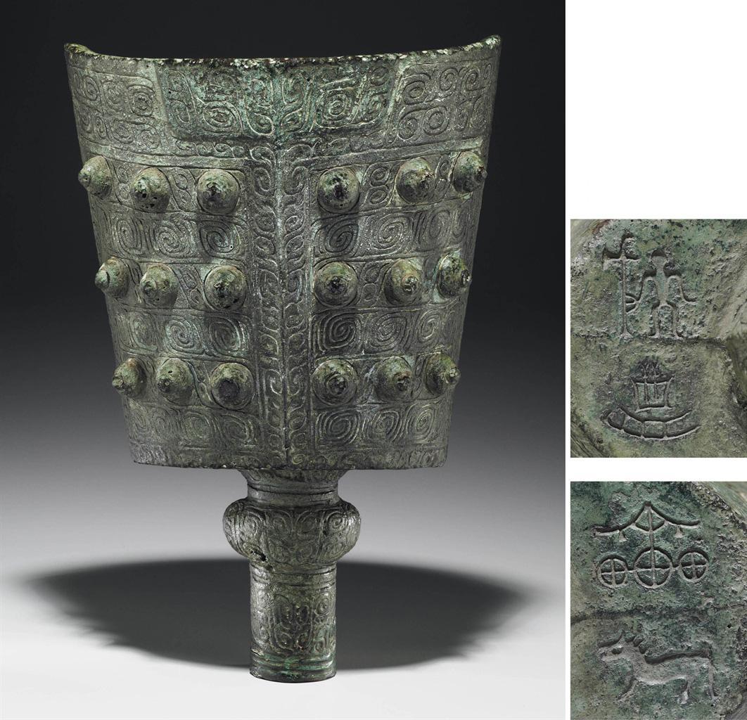 紋青銅大鐃通高77.8厘米,銑間56.6厘米,重100.35千克。西周。樂器。平口,鉦部兩側有36個*紋乳突狀枚,枚直徑3.5厘米,高2厘米。鼓飾變形獸面紋,兩側飾雲雷紋。甬亦飾變形獸面紋。大鐃雙範合鑄,渾大厚重,作風穩重古樸。表現出很高的鑄造工藝水平,是福建出土的最大的青銅器。1978年,建甌縣(今建甌市)小橋公社陽澤大隊黃科山出土。原通高76.8厘米,因柄與鐃體被人為鋸斷再經銲接,通高多出1厘米。現藏福建省博物館。