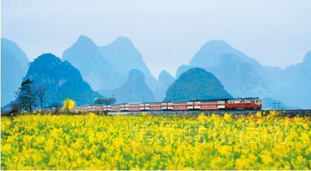 從廣州乘坐火車前往雲貴高原,仿佛就是一段回歸大自然的旅程,沿途的秀美風光以及人文風情,讓人的心靈得到愉悅的享受。而粵西地區淳樸的風光便是我們旅程首先遇到的禮物,尤其是雷州半島那一望無際的芭蕉、蔗林以及桉樹林的紅土風光,美不勝收。接下來,火車會在不經意間闖進廣西,奇山秀水讓人目不暇接。喀斯特地貌的山地峰林星羅棋布,形成了一幅完美的天然風景畫卷。一些突兀出現在眼前的石林提醒我們進入了雲貴高原,窗外的紅土高坡上是層重疊顯示疊的梯田美景,田野間還有人在辛勤勞作。