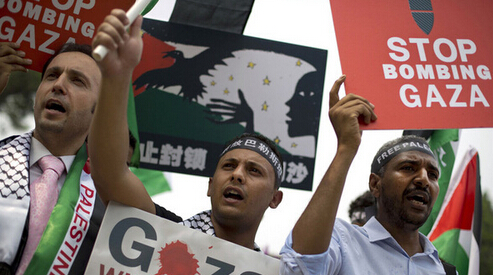 18日,多国民众在巴勒斯坦驻中国北京大使馆外举行集会游行,抗议以色列攻击加沙地带造成巴方大量人员伤亡事件,他们甚至打出了要求“解放巴勒斯坦”的标语。
