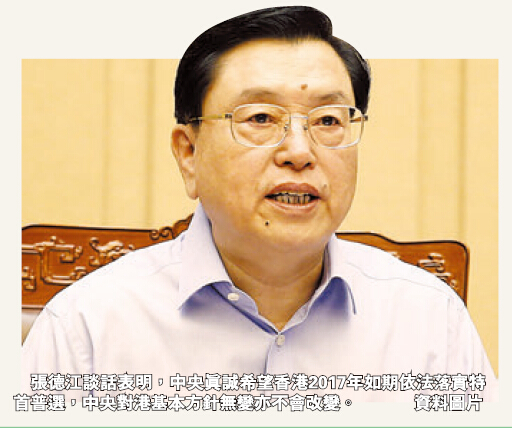 綜觀張德江講話,他提出了四點重要意見:第一,中央堅定不移貫徹落實「一國兩制」、「港人治港」、高度自治;第二,中央真誠希望2017年可以順利實行特首普選,希望香港在《基本法》和人大決定的基礎上,理性討論、凝聚共識;第三,希望香港抓住與內地的共同發展機遇,為實現中華民族偉大復興的「中國夢」發揮積極作用;第四,行政長官必須由愛國愛港人士擔任。至於具體安排,包括提名委員會的組成、提名程序與門檻、以至有關「公民提名」等,張德江重申必須按照《基本法》和全國人大常委會的決定。說到底,「如期依法」四個字,前者是中央對香港實現普選的期望,後者則是本港落實普選的唯一途徑。
