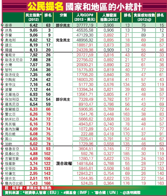 事實上,以經濟學人智庫(EIU)的「民主指數」衡量,有關國家和地區的民主發展,不但較本港現狀——即是2017年可以實現普選之前——還要遜色,不少更加是敬陪末席。那麼,為何「公民提名」會被視為終極民主的目標?就如幾內亞比紹,即使采用「公民提名」,其民主排名就排尾二,只比朝鮮高,其餘多個中亞和非洲地方,也同樣被歸類為最不民主的「混合政權」,另外幾乎一半地方的評分和排名較「部分民主」的香港低。當然,仍有多個國家和地區名列前茅,不過能夠躋身首十名的只有兩個,首廿名的亦僅5個,反過來說,即是更多實施其他民主模式的地方比設置「公民提名」的更加民主。