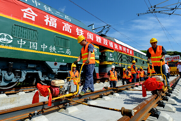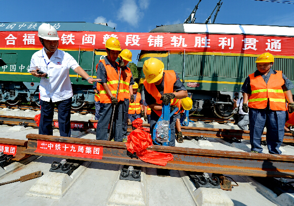 当日,随着福建武夷山境内最后一对128米长钢轨铺设成功,合福高铁(合肥-福州)闽赣段铺轨贯通。