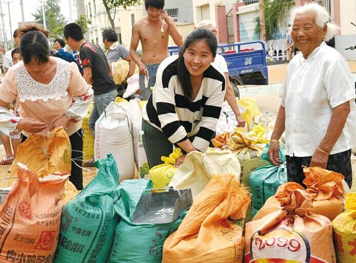 今年,江苏省赣榆县塔山镇小官村按照村民意愿实行土地集中流转,由村农民专业合作社代管土地,夏秋两季按各户人口分领小麦和稻谷,解决村民一家一户解决不了的耕种收难题。(新华社)