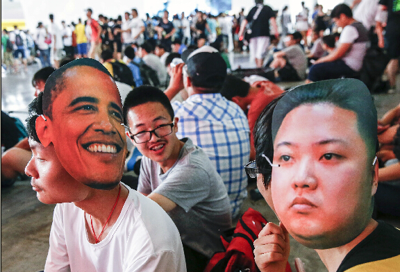 7月31日,两名分别头戴“奥巴马”与“金正恩”面具的年轻人在展厅休息。当日,第十二届中国国际数码交互娱乐展览会(ChinaJoy)在上海向公众开放,本次展会主题为“塑造世界游戏新格局”,暴雪、EA、盛大、腾讯、网易等国内外知名游戏公司设置展台。中新社发 张浩 摄