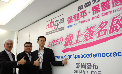 「保普選‧反佔中大聯盟」今日推出「網上簽名」行動,不方便到街站簽名的市民可登入http://www.sign4peacedemocracy.hk參加行動。另外,自由黨立法會議員田北俊、張宇人及多名成員將在今天及明天早上11點現身銅鑼灣時代廣場,聲援「網上簽名」行動。愛港之聲等團體亦會在今明兩天現身各區街站,為實體簽名行動打氣。