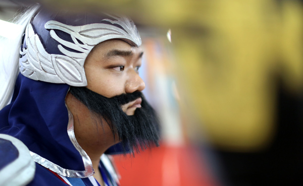 8月5日,一位男孩在博览会闭幕日上展示他的cosplay造型。