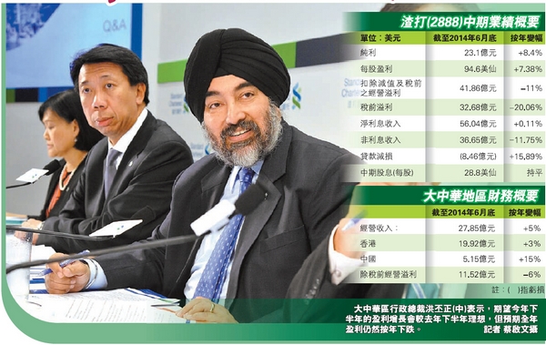 【香港商报讯】记者林德芬报道:面对韩国业务亏损,已发盈警的渣打集团(2888)半年赚23.1亿元(美元,下同),折合约180.02亿港元,按年升8%,税前溢利倒退20.06%,至32.68亿元,符合预期,每股盈利94.6美仙,派中期息28.8美仙。渣打管理层表示,面对监管,市况疲弱,连同受韩国业务拖累,料今年全年盈利会按年下跌。