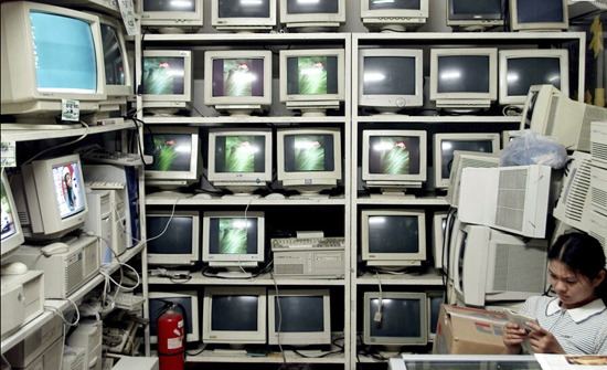 网络游戏的盛行,吸引中国最早的一批忠实网友,网吧行业也随之步入黄金时代,成为人们新的休闲圣地。图为2002年,北京一家二手商店内摆满了从网吧回收的二手电脑。