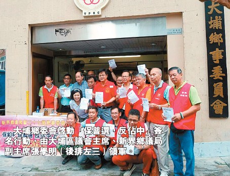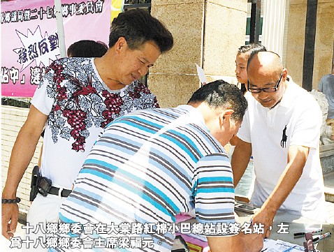 新界27個鄉委會聯繫村民的「保普選反佔中」簽名運動如火如荼。十八鄉鄉委會主席梁福元與一眾執委們積極響應鄉議局的號召,發動村代表及村民們支持簽名運動,自7月19日起在鄉事委員會會址設立簽名站,並在元朗大棠路紅棉圍小巴總站及大棠村廣場設立流動簽名站,更於每天黃昏5時起的下班高峰期,在元朗西鐵站公共通道上「擺街檔」,呼籲村民及居民簽名支持,反應十分熱烈,不分男、女,無論是村民及居民都主動簽名支持,尤以中年人士最為踴躍,他們最為關心的是下一代的福祉。