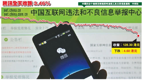 【香港商报讯】中国国家互联网信息办公室昨日发布规定,对微信等即时通信工具如何提供公众信息服务做出规范,其中包括实名制、未经批准的非新闻单位公众账号不得发布时政类新闻等十条规定。即时通信工具开启监管大幕。受此影响,腾讯(00700)当天股价收盘报128.30港元,跌3.46%。