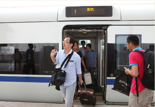 旅客从停靠在广安南站的动车上走出