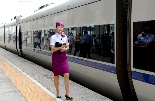 一位乘务员从即将开行的动车旁走过