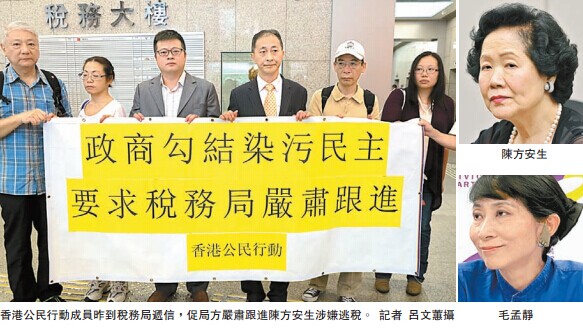 【香港商報訊】記者呂文蕙、何加祺報道:壹傳媒集團主席黎智英(肥佬黎)早前被揭發以巨款資助反對派人士的「政治獻金」醜聞,繼續引起社會各界人士和團體不滿。香港公民行動數名成員昨日到稅務局遞交投訴信,指前政務司司長兼「香港2020」召集人陳方安生,涉嫌收受「捐款」后替壹傳媒集團主席黎智英辦事,質疑有關「捐款」實為服務酬金,促請局方嚴肅跟進,依法查處是否有人蓄意逃稅。另外,有網民到公民黨立法會議員毛孟靜位於美孚新恏的辦事處抗議,指她不肯承認收取黎智英巨額獻金,并要求毛孟靜立即下台。