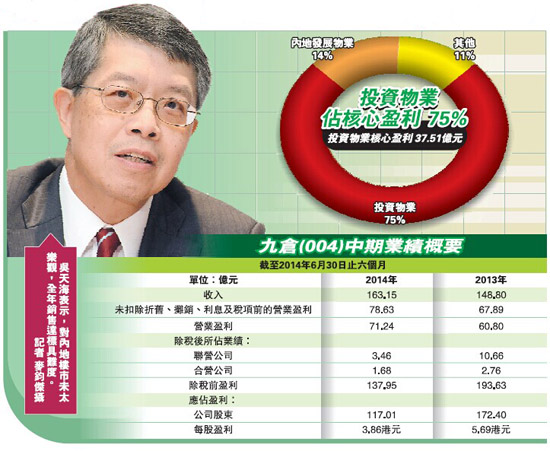 上半年集團於內地的合約銷售錄89億元人民幣,按年跌18%。副主席兼常務董事吳天海於業績記者會上坦言,暫時對內地樓市不是太樂觀,全年達到230億元人民幣的銷售目標具有難度,但強調會盡量做到接近目標。近年內地房地產市場處於下行趨勢,吳天海認為,整體來說內地房地產市場存在問題,但就對商業地產具信心,未來將專注於投資物業。