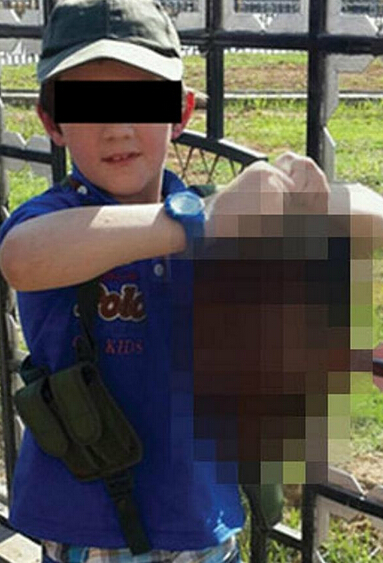 一名澳大利亚籍的ISIS武装分子Khaled Sharrouf让自己年仅7岁的儿子双手提着被害叙利亚政府军士兵人头拍照,并将照片上传到社交媒体(twitter)炫耀武力:“看,这是我儿子”。