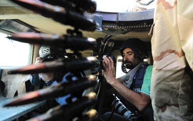 16日,载着媒体记者的伊拉克库尔德武装军车正在巡逻。目前西方正全力援助库尔德武装。