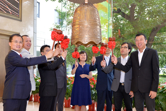 8月22日,北京吉芬时装设计股份有限公司董事长、艺术总监谢锋(右一)携公司高管和广发证券代表及会计、律师代表在北京金融街全国中小企业股份转让交易系统共同敲响“上市宝钟”。