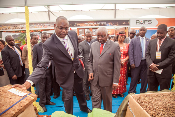8月25日,在莫桑比克首都马普托,莫桑比克总统阿曼多·格布扎(前右)参观第50届马普托国际展会。