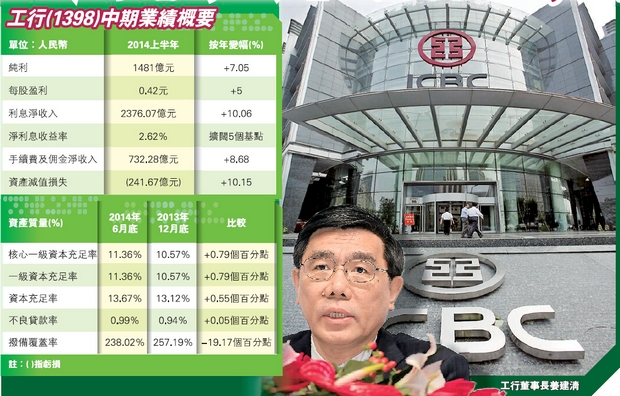 上半年净利息收益率為2.62厘,按年及較去年全年都擴闊5個基點。工商銀行行長易會滿昨日在北京業績發布會上表示,上半年净息差擴闊,主要受債券投資收益率較年初上升16個基點帶動,并預計下半年净息差平穩。與其他內銀一樣,工行也面對資產質素持續轉差,不良貸款餘額及比率雙升;不良貸款率由去年底0.94%,升至今年6月的0.99%,仍低於1%;不良貸款餘額1057.41億元,比上年底增加120.52億元,但與已公布業績的同業比較,并不算高。