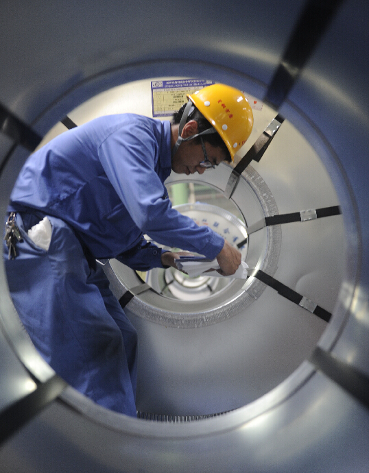 工人在首钢京唐钢铁公司冷轧钢卷成品车间给产品贴标签