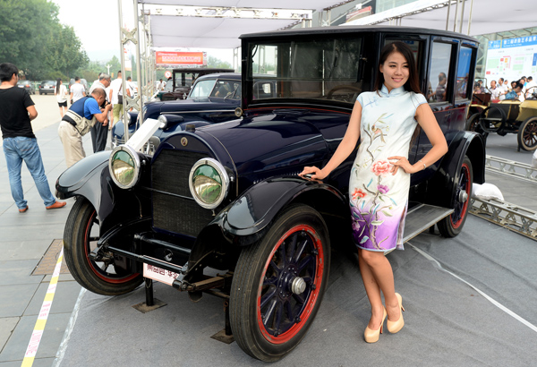 8月28日,模特在济南舜耕国际会展中心广场展示老爷车。