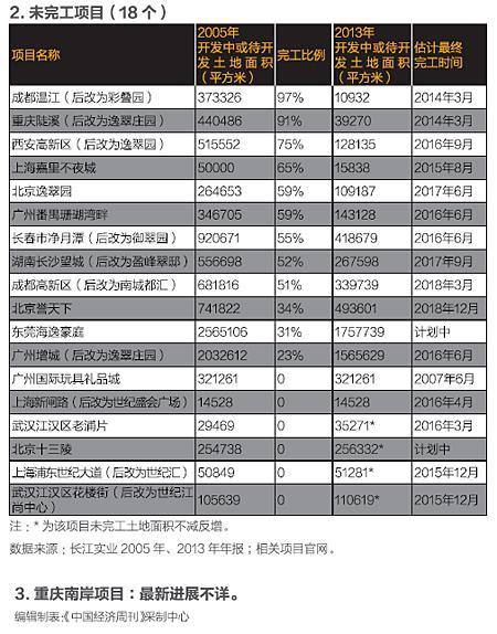 长江实业2005年年报显示,当年长江实业在内地共有29个项目,大多数项目的估计完工时间是2006、2007、2008年。而长江实业2013年年报显示,这29个项目中,只有10个项目处于已完工状态;有18个项目处于未完工状态,且最终完工时间普遍调整为2015、2016年左右;另有一个项目重庆南岸,具体开发信息不详。