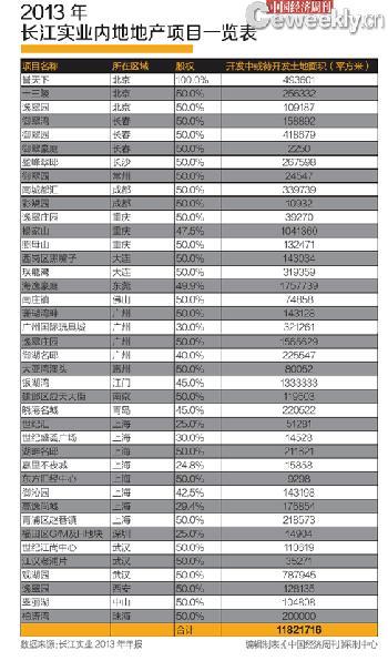 长江实业2013年年报显示,该公司所有或参与的“开发中或待开发土地面积”达1182万平方米。李嘉诚作为董事会主席,在长江实业2014年半年报中回顾上半年业务时表示,上半年,内地多个物业项目的住宅单位销售或预售进展缓慢,部分城市销售情况逊于预期。此外,长江实业2012年、2013年年报及2014年半年报显示,2012年以来,该公司在内地只拿过一块地。
