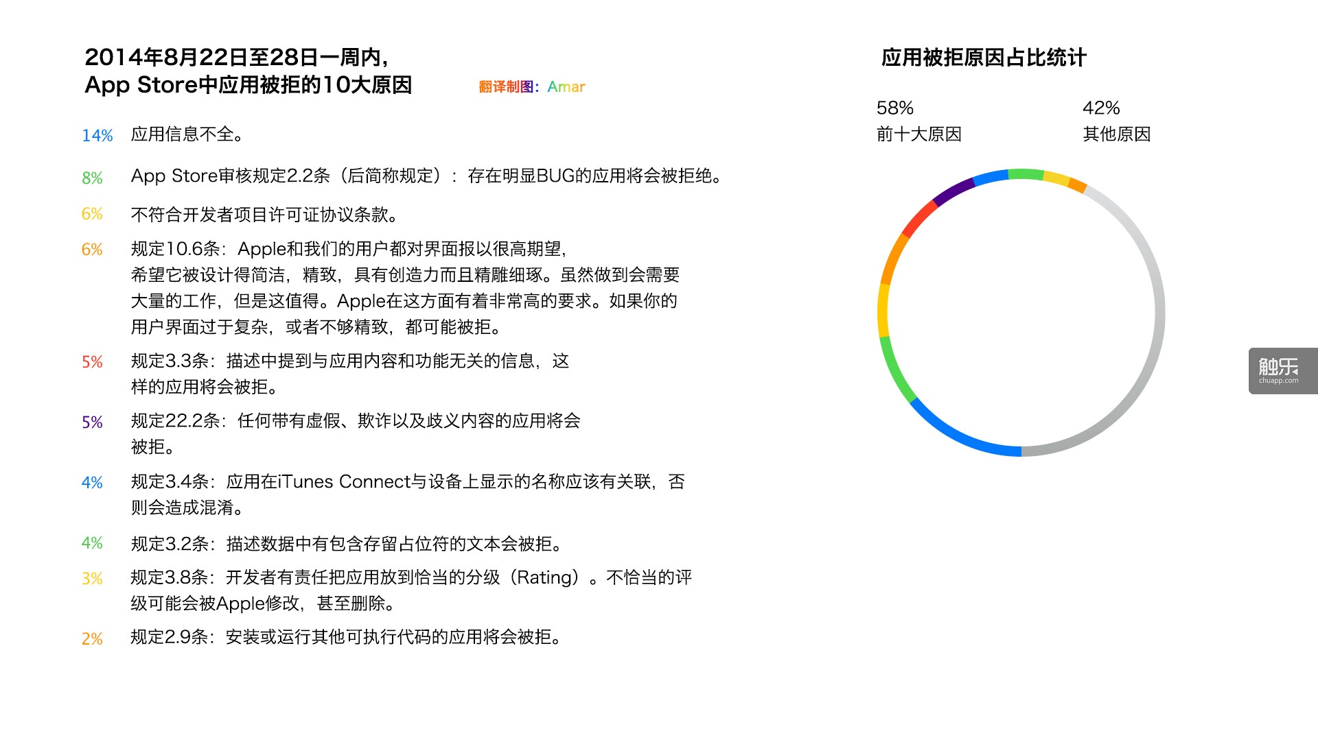 近日,苹果在官方的开发者网站中创建了一个页面,列举了常见的应用被拒原因,并且给出了8月22日至8月28日一周内应用被拒原因的Topten图表。通过图表我们可以看到,在从22日开始的一周中,应用被拒的十大原因中有八条都是因为违反了App Store官方的审核规定。或许正是因为在短时间内遇到了大量的“明知故犯”的情况,苹果才会出此下策,将这些问题列举出来,供开发者先行参考。
