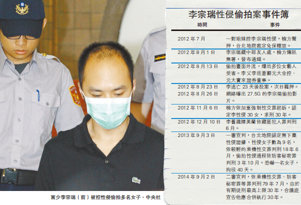 時間事件2012年7月一對姐妹控李宗瑞性侵,檢方聲押,台北地院裁定免保釋放。2012年8月1日李宗瑞藏中部友人處,檢方傳訊無著,發布通緝。2012年8月13日偷拍畫面外流,爆出多位女藝人受害。李父李岳蒼辭元大金控、元大寶來證券董事。2012年8月23日李逃亡23天后投案,次日羈押。2012年8月26日網絡曝出27.5G的李宗瑞偷拍影片。2012年11月6日檢方依加重強制性交罪起訴,認定李性侵30女,求刑30年。2012年12月10日李舊識陳美蘭依藏匿犯人罪判刑6月。2013年9月3日一審宣判,台北地院認定無下藥性侵證據,性侵女子數為9名,依較輕的乘機性交罪判刑18年6月,偷拍性侵過程依妨害秘密罪判刑3年10月,恐嚇一名女子,拘役40天。2014年9月2日二審宣判,依乘機性交罪、妨害秘密罪等罪判刑79年7月,由於有期徒刑最高上限30年,合議庭宣告他應合併執行30年。