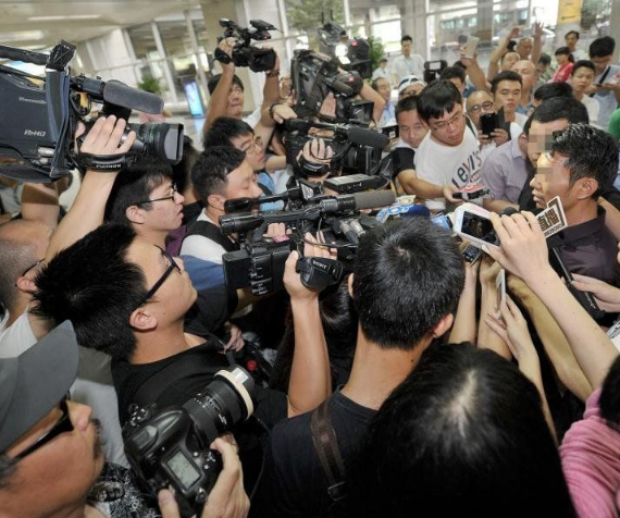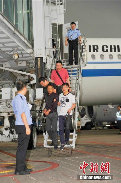 因涉嫌合同诈骗离境出逃的浙江丽水青田人吴某某9月2日从哥伦比亚被顺利押解回中国,媒体在机场采访吴某。浙江警方称,这是中国通过国际警务合作,首次从南美洲成功遣返境外在逃经济犯罪嫌疑人。目前,金华警方已将吴某某押解回义乌进行进一步审理。“猎狐2014”行动开展以来,中国警方已先后从多个国家和地区成功将11名重大经济犯罪嫌疑人缉捕回国,其中2名犯罪嫌疑人系主动回中国自首。中新社发 周尔博 摄